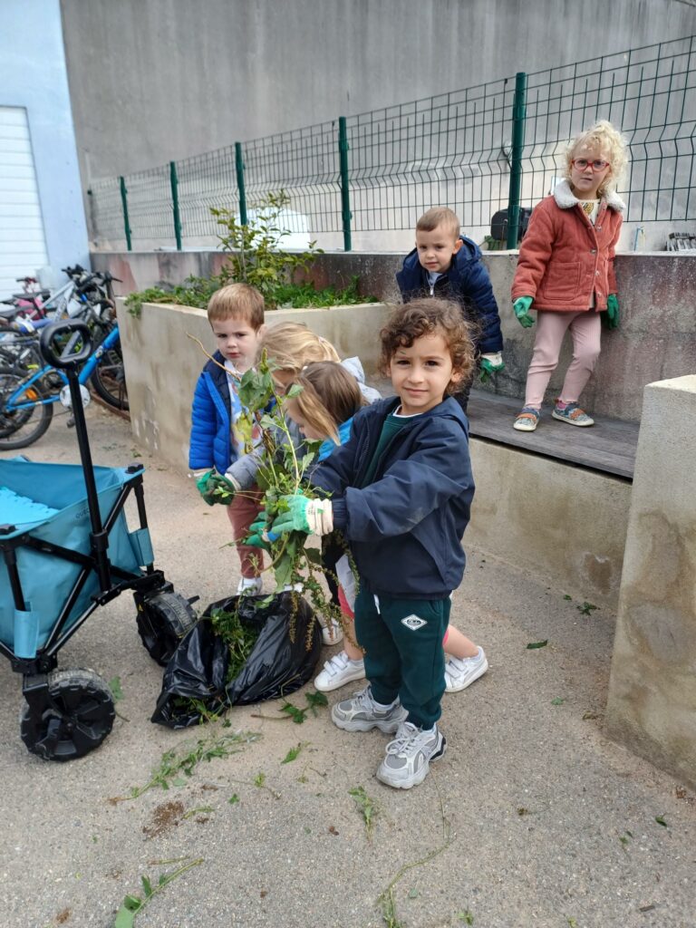 Une fois les gants enfilés, ce qui n’est pas une mince affaire, nous avons entrepris de désherber 2 bacs de plantes sur la cour des grands. Un peu fatigant d’arracher toutes ces mauvaises herbes !