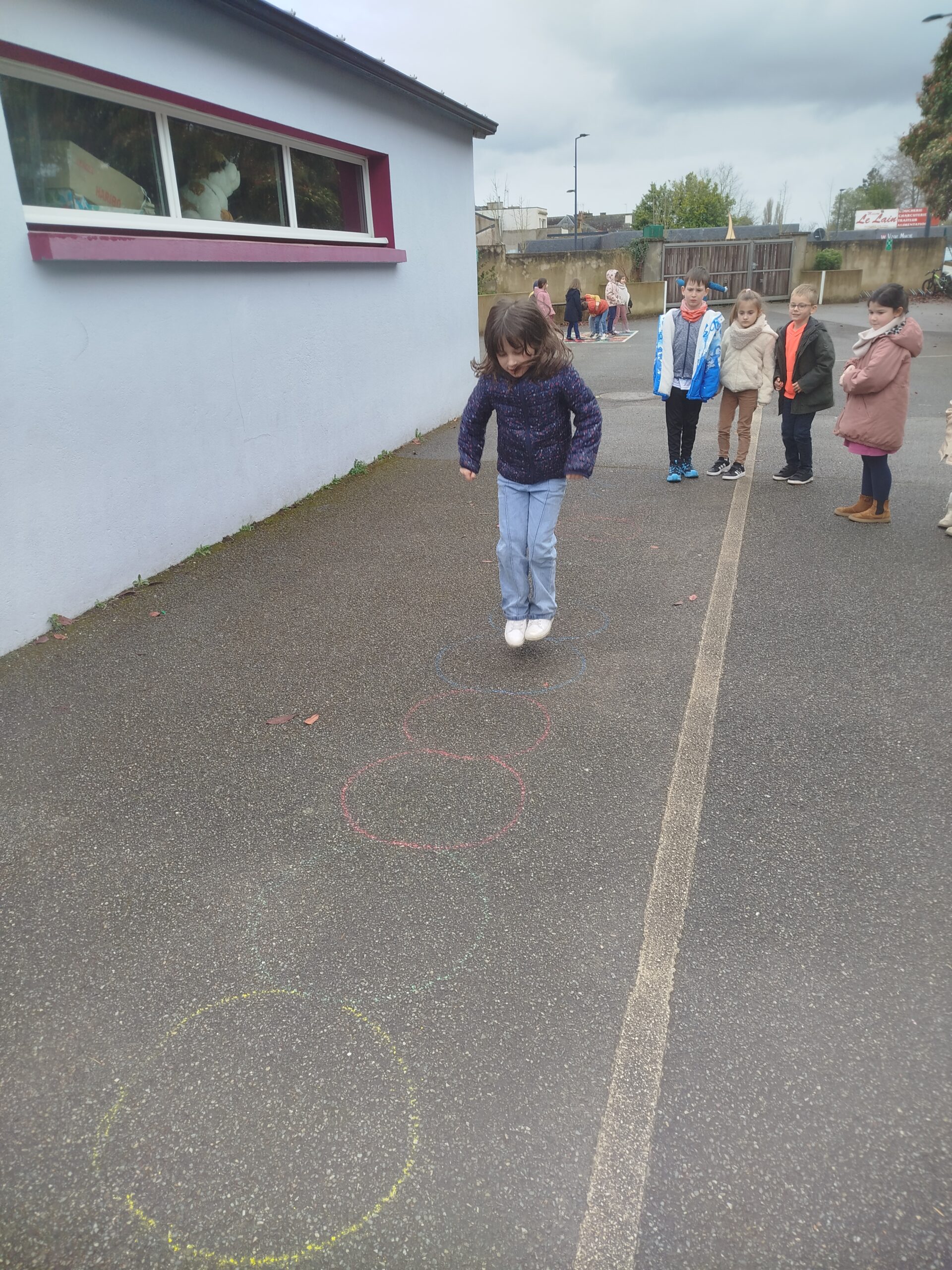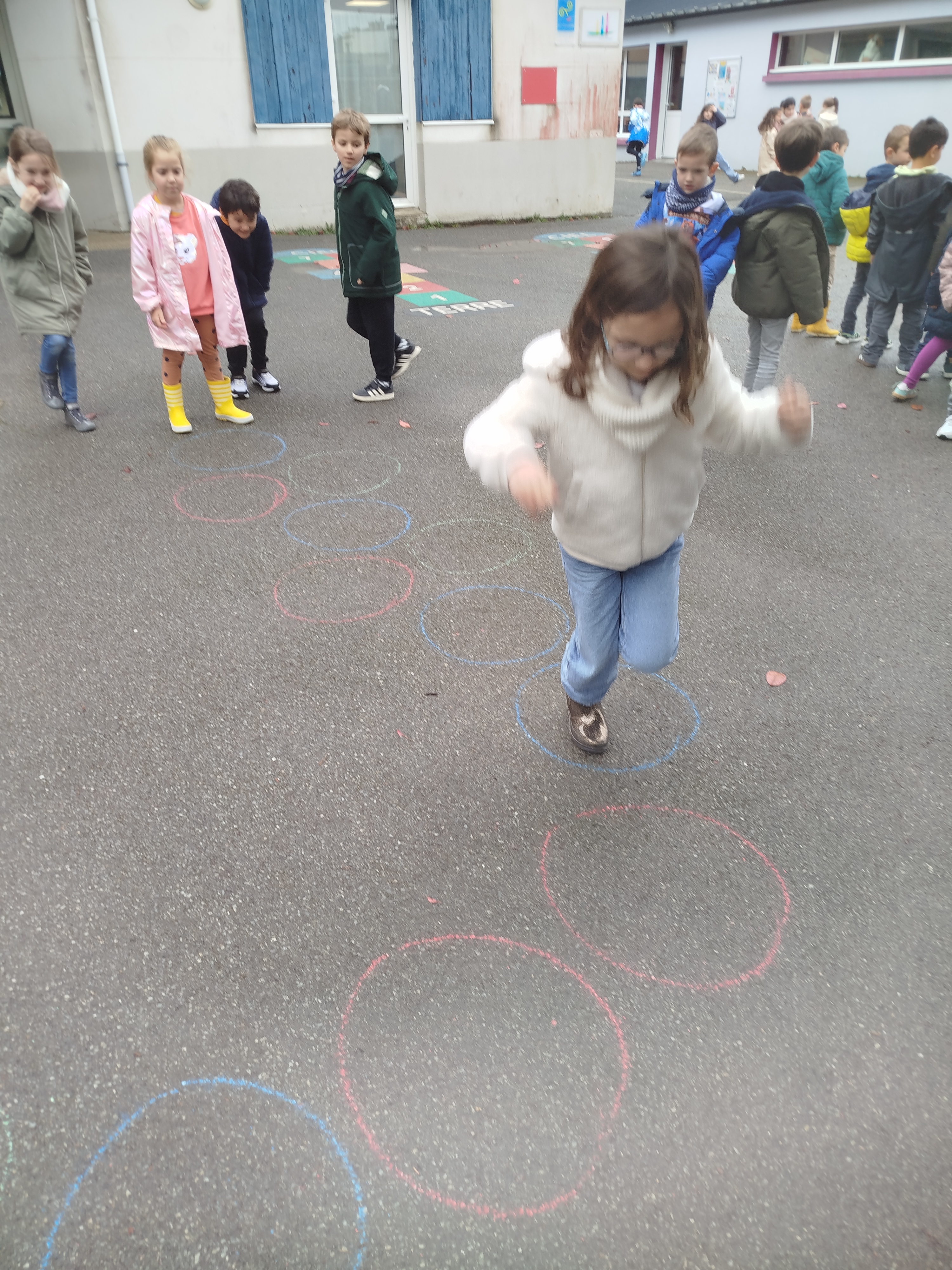 Attention chaque couleur correspond à un saut particulier (pieds joints, pied droit, pied gauche ou pieds à l’extérieur du cerceau). Pas simple au début de coordonner la vue et l’action motrice à effectuer.